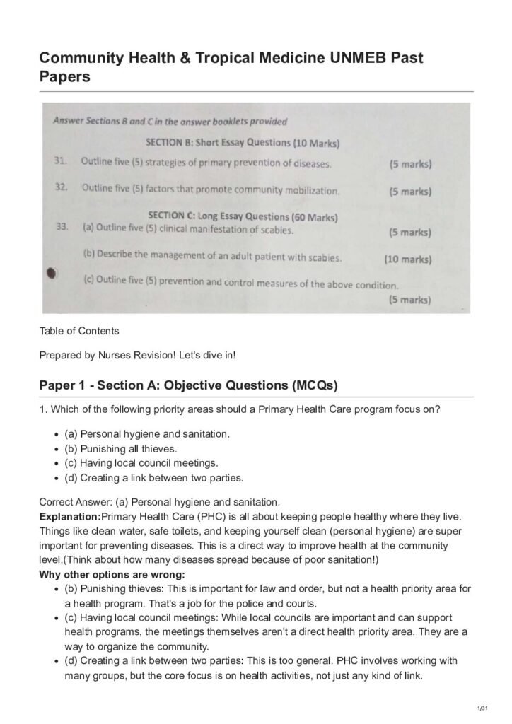 Community Health-Tropical Medicine UNMEB Past Paper: Test yourself with 40 MCQs, 20 fill-ins, short, and long essay questions across paper 1 (commu…
